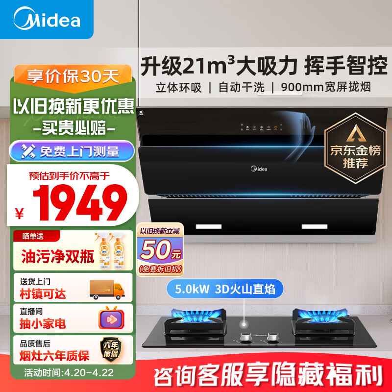 美的(Midea)抽油烟机灶具套装 家用侧吸式21大吸力自清洁挥手吸烟机 5kW燃气灶J25S+Q230A天然气套装价格:1949.00元!