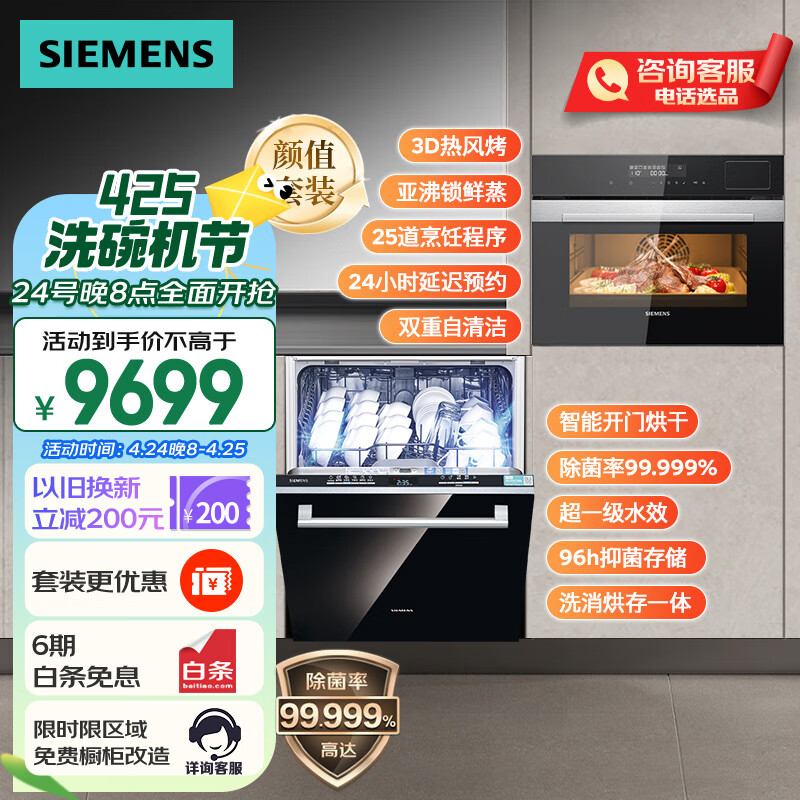 西门子14套大容量嵌入式家用智能开门烘干洗碗机 嵌入式蒸烤一体机套装 636Pro(含黑门板)+CS389价格:9699.00元!