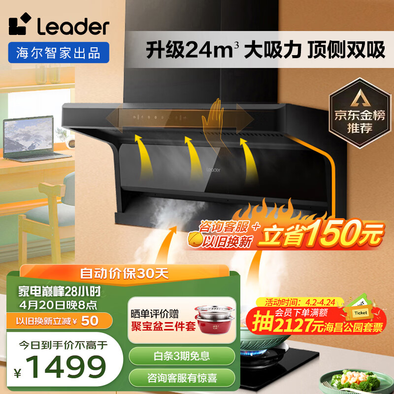Leader抽油烟机顶侧双吸 7字型家用抽烟机 升级24立方大吸力 三腔速吸挥手智控自清洁 海尔智家出品IQ92D价格:1699.00元!