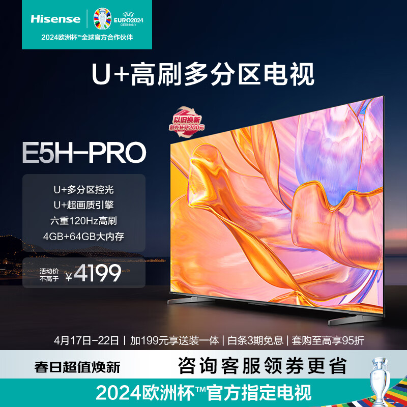 海信电视75E5H-PRO 75英寸 多分区控光 六重120Hz高刷 4K高清智慧屏 液晶智能平板电视机 以旧换新价格:4199.00元!