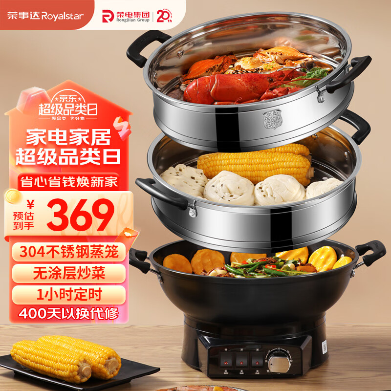 荣事达 电蒸锅电炒锅多功能电热锅多用电火锅山东锅电煮锅双层 大容量电锅DRG-T38X价格:369.00元!