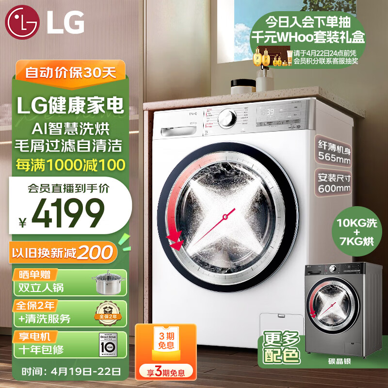 LG小旋风系列 10KG超薄洗烘一体机家用 直驱变频 自动脱水烘干 蒸汽除菌 360°速净喷淋 白 FCW10D4WA价格:4799.00元!