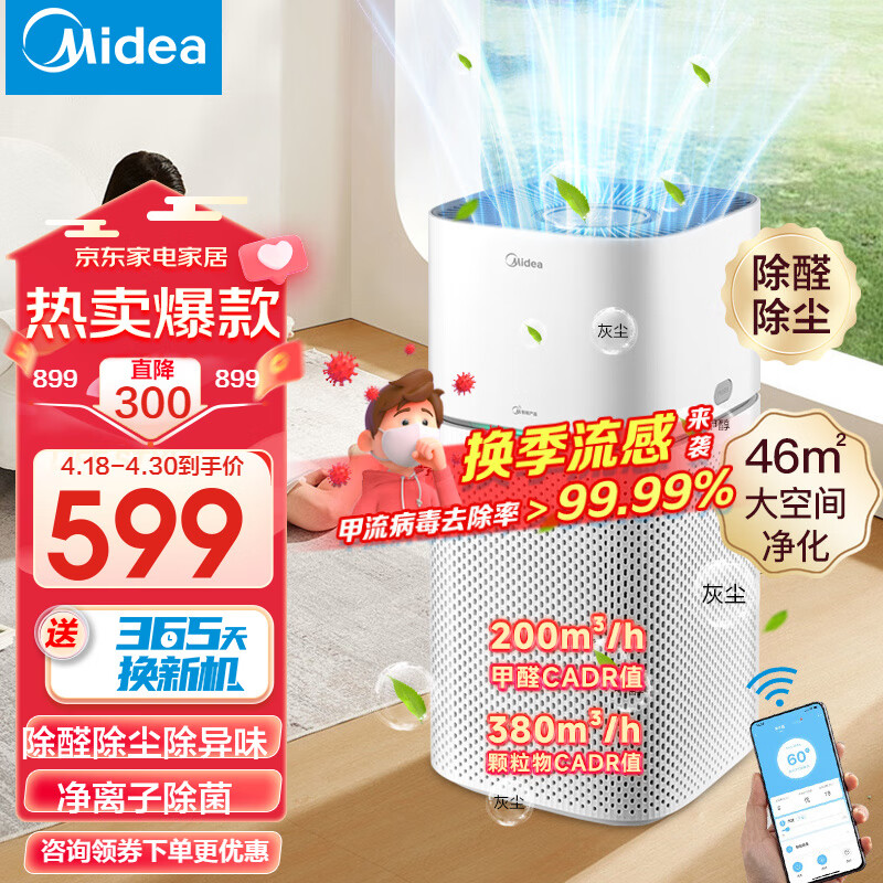 美的(Midea) 空气净化器除甲醛家用新风机净离子除菌全屋换气除雾霾烟味灰尘智能数显美居互联消毒机 【净化除醛】KJ400G-Z1 Pro价格:899.00元!