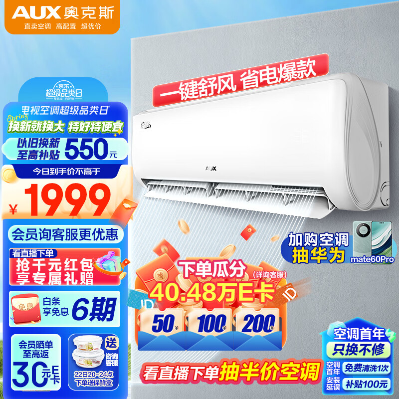 奥克斯(AUX)大1匹 新1级能效 易拆银离子滤网 变频冷暖 京裕Ⅱ空调挂机(KFR-26GW/BpR3AQE1(B1)) 独立除湿价格:1899.00元!
