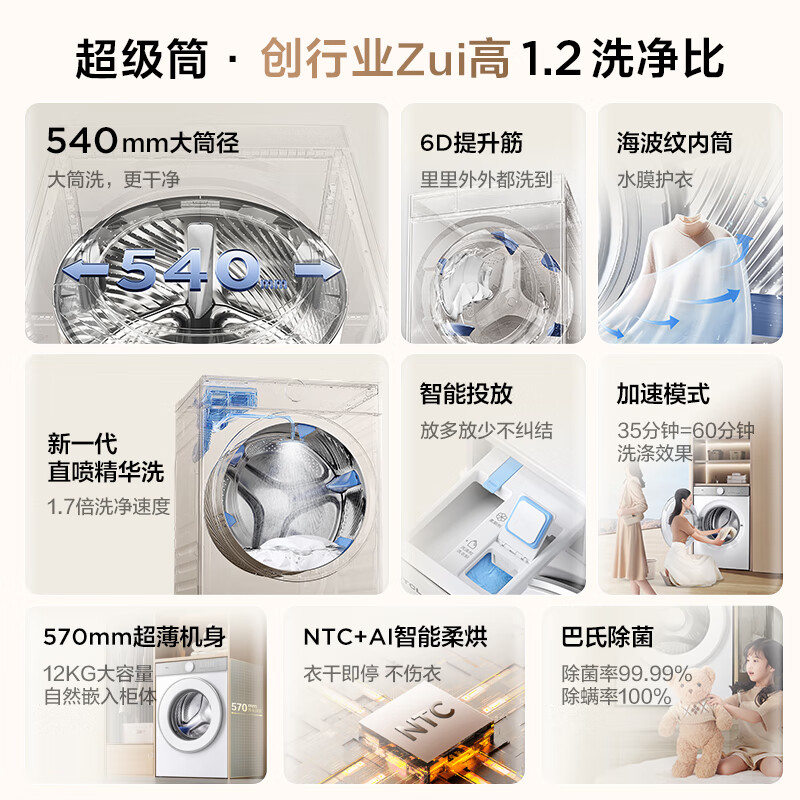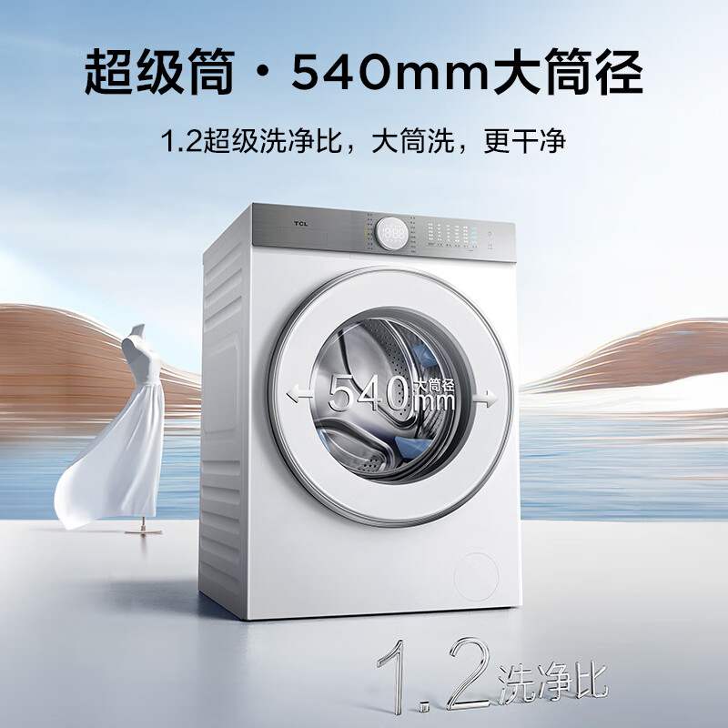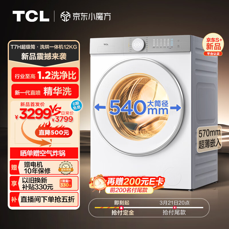 TCL 12公斤超级筒T7H超薄洗烘一体机滚筒洗衣机 1.2洗净比 精华洗 540mm大筒径 智能投放 G120T7H-HDI价格:3799.00元!