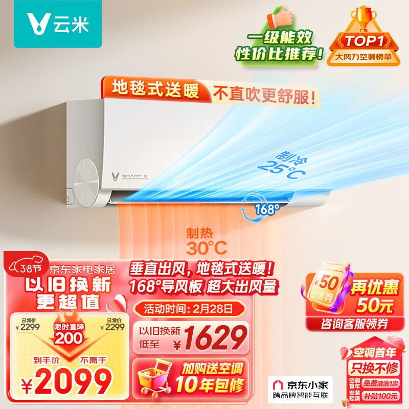 云米(VIOMI)空调1.5匹 京东小家智能 变频冷暖 Smart 3新一级以旧换新舒适风尊享空调挂机KKFRd-35GW/Y3PQ7-A1价格:2099.00元!