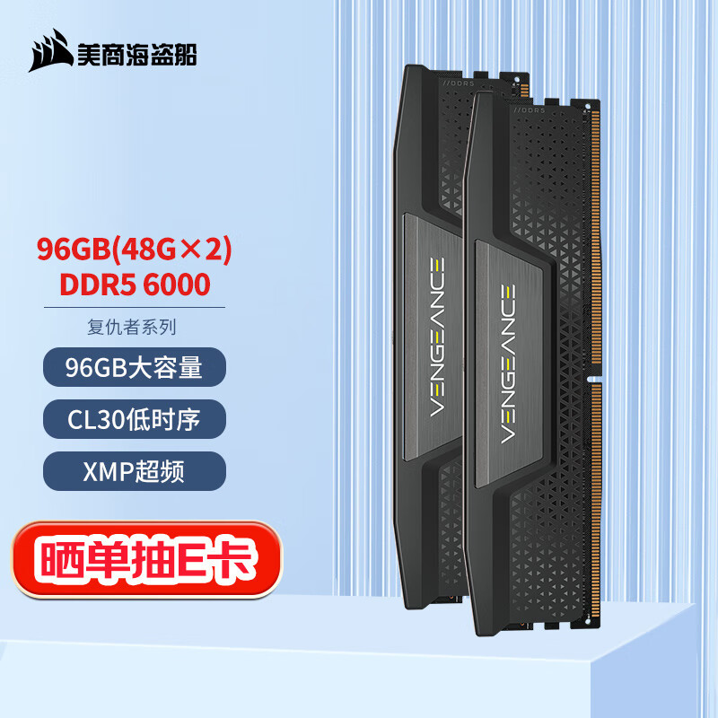 美商海盗船 (USCORSAIR) 96GB(48Gx2)套装 DDR5 6000 台式机内存条 复仇者系列 游戏条 黑色 C30价格:2999.00元!