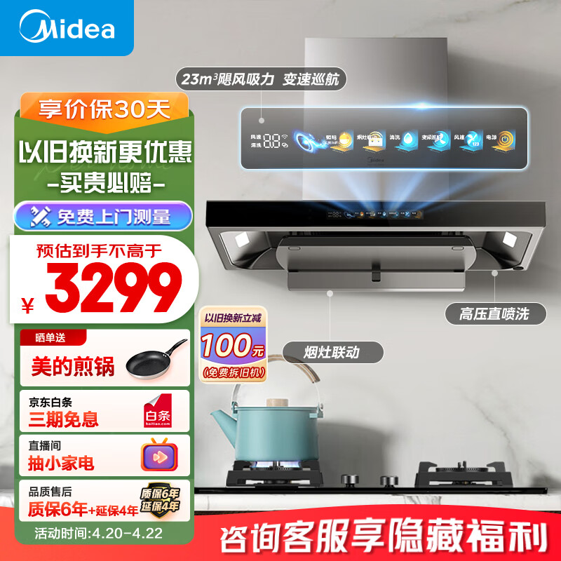 美的(Midea)抽油烟机5.2kW防干烧燃气灶家用顶吸23风量超真实屏挥手智控变频烟灶联动TP70+Q518S天然气套装价格:3299.00元!