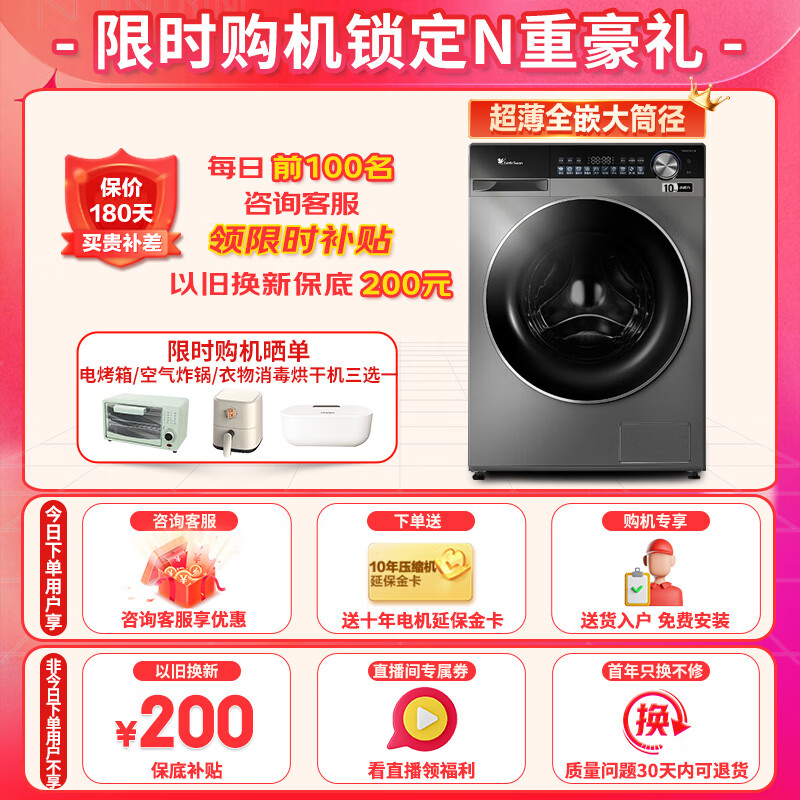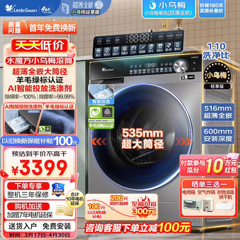 小天鹅(LittleSwan)10公斤水魔方滚筒洗衣机轻享版小乌梅超薄全嵌冷水洗智投放大筒径羊毛绿标认证1.1高洗净比洗衣机 【小乌梅轻享版滚筒】TG100SC18价格:3199.00元!