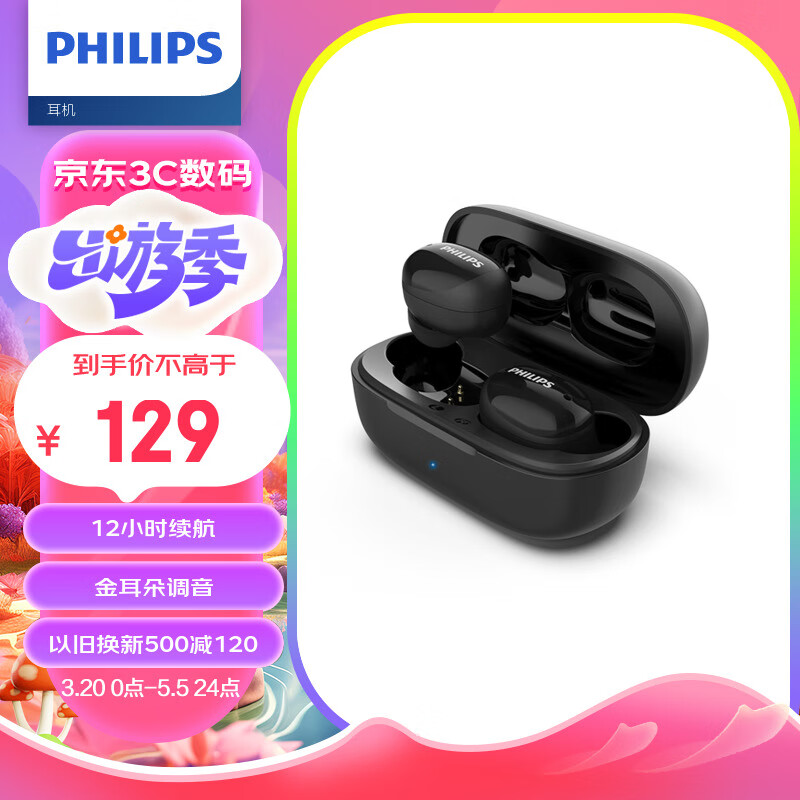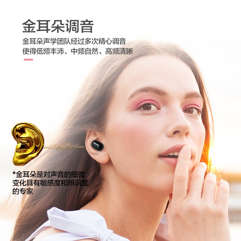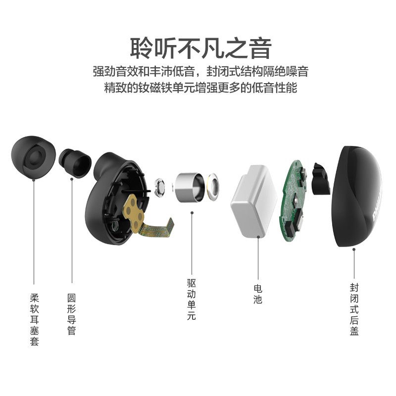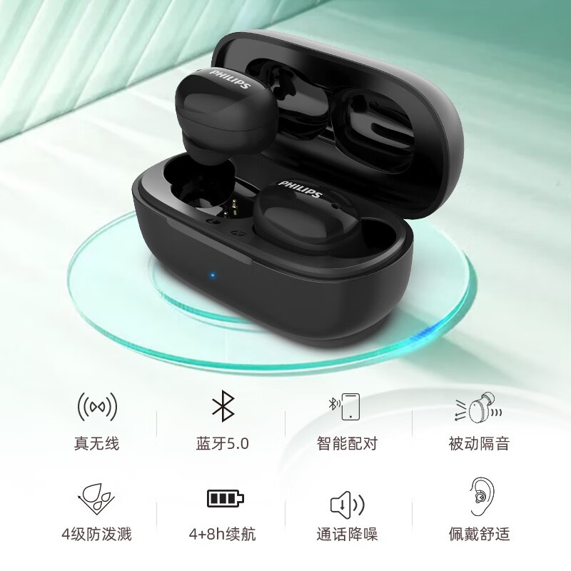 飞利浦(PHILIPS)真无线蓝牙耳机入耳式防水智能能配对通话降噪被动隔音 苹果安卓手机通用TAT2255价格:129.00元!