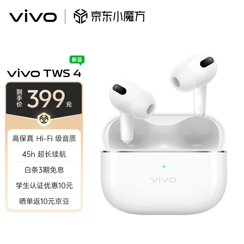 vivo TWS 4真无线降噪耳机 高保真Hi-Fi 级音质 55dB深海降噪 45H超长续航苹果小米华为手机通用远峰白价格:399.00元!