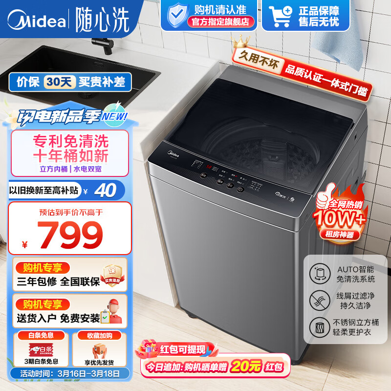 美的(Midea)洗衣机全自动波轮 8公斤大容量宿舍租房神器 9小时预约家用脱水甩干免清洗小型迷你不占地水电双宽 【随心洗系列】MB80V33B价格:799.00元!
