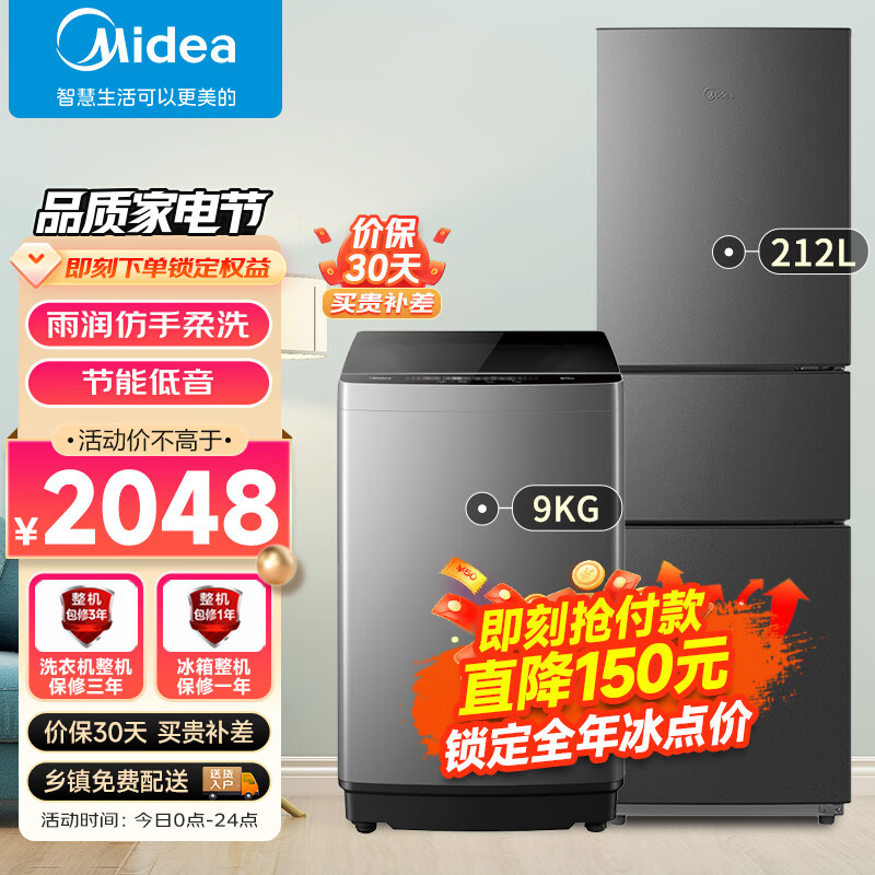 美的(Midea)冰洗套装 小型宿舍租房节能冰洗套212升三门家用冰箱+9公斤波轮全自动洗衣机价格:2048.00元!