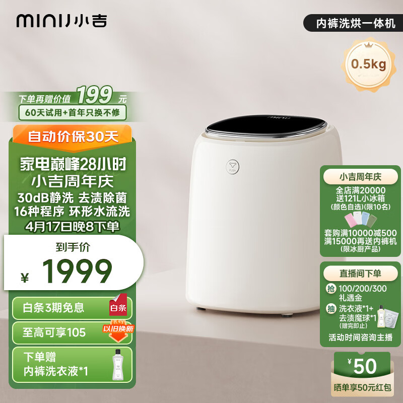小吉(MINIJ)0.5kg内裤洗衣机小型洗烘一体变频高温煮洗去血渍全自动内衣洗衣机U10-M2价格:1999.00元!
