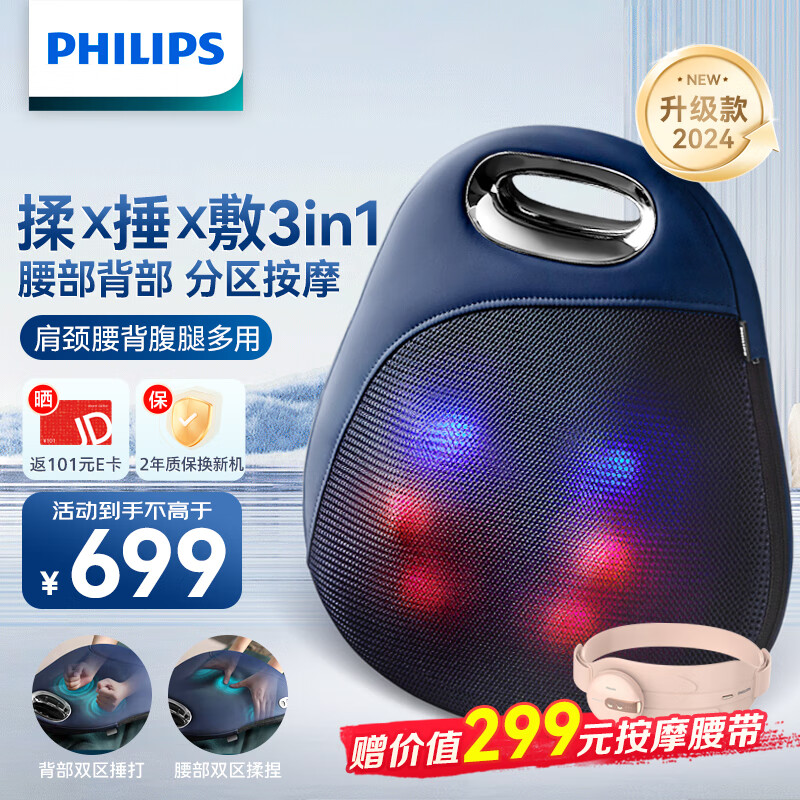 飞利浦(PHILIPS)腰部按摩器无线背部按摩仪多功能腰背按摩抱枕热敷捶打揉捏靠背 生日礼物送父母长辈5111B价格:779.00元!