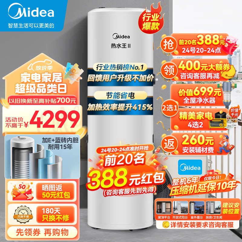 美的(Midea)空气能热水器家用200升包安装升级R32冷媒水电分离WIFI智控热水王二代RSJF-33/N8-200D(E2)价格:4499.00元!