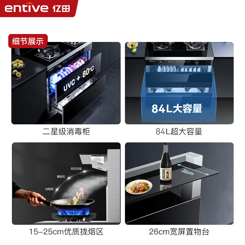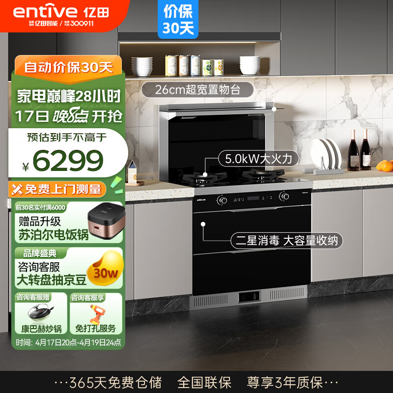 亿田 集成灶消毒烘干柜 80度恒温消毒 集成灶一体灶家用 Q-J02D玻璃台面 液化气价格:6299.00元!