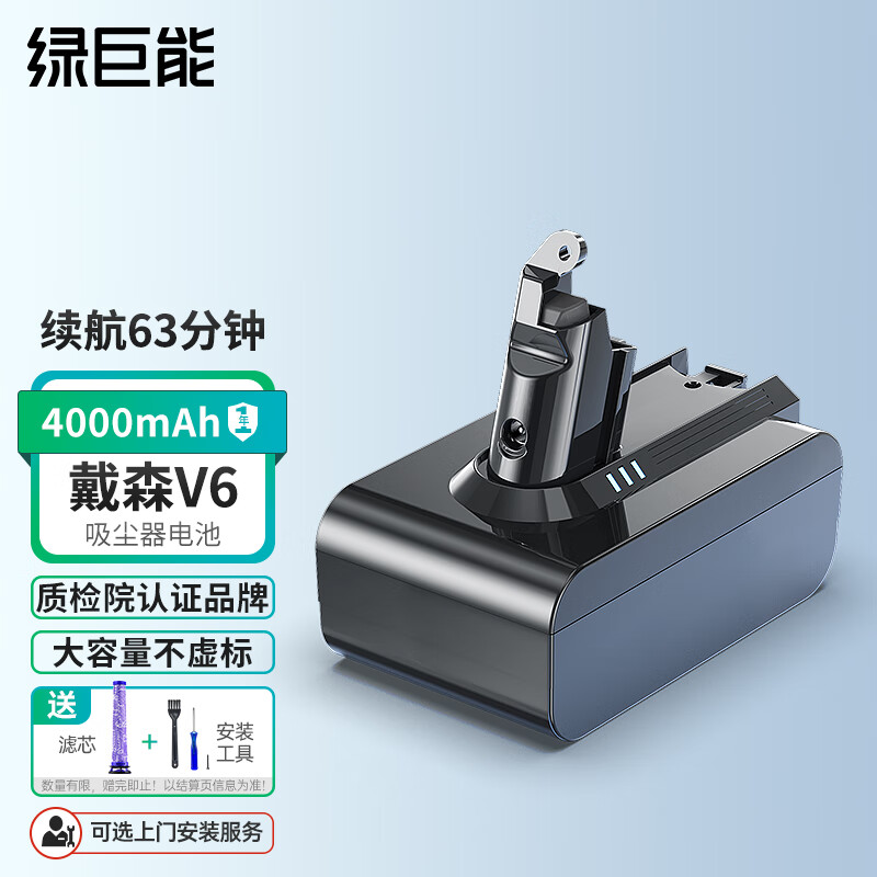 绿巨能(llano)适用戴森Dyson电池 V6吸尘器电池配件 充电锂电池替代品DC59/62/74等型号大容量5000mAh 灰色价格:389.00元!