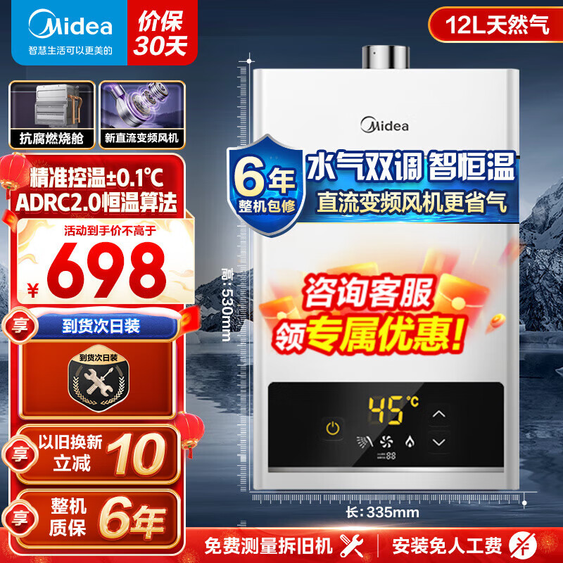 美的(Midea)燃气热水器家用即热强排式恒温节能省气防冻健康净浴CO防泄漏小体积天燃气厨房热水器HWF系列 12L 变频节能恒温升级 天然气价格:849.00元!