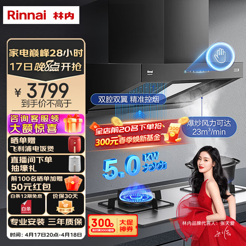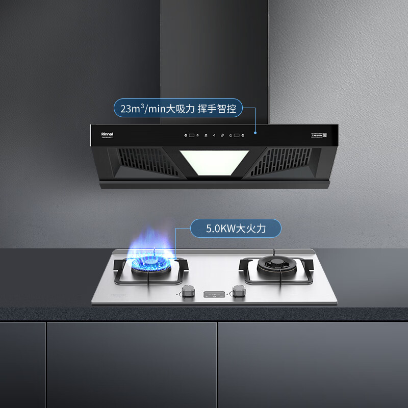 林内(Rinnai)欧式跨界抽烟机 23立方大吸力 挥手智控自热清洗 5.0KW智能定时燃气灶 NM11T+2E08MT 天然气价格:3799.00元!