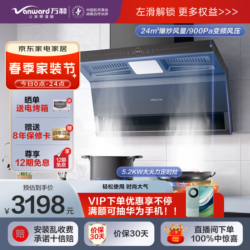 万和(Vanward)顶侧双吸1000Pa三腔直流变频家用抽油烟机 燃气灶具烟灶套装 25m3/min大吸力 WL860+T9L96(天然气)价格:3398.00元!
