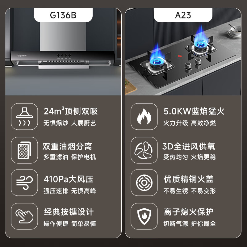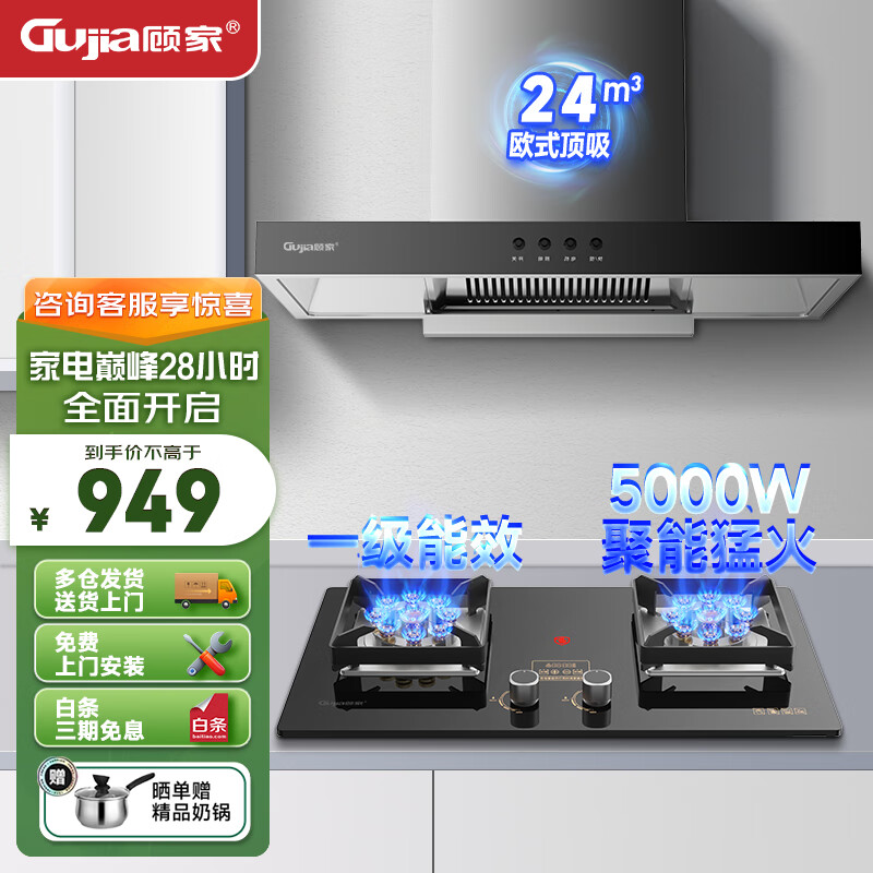 顾家(Gujia)抽油烟机灶具套装24爆炒大吸力家用欧式顶吸油烟机5.0KW燃气灶两件套(液化气) 价格:1249.00元!