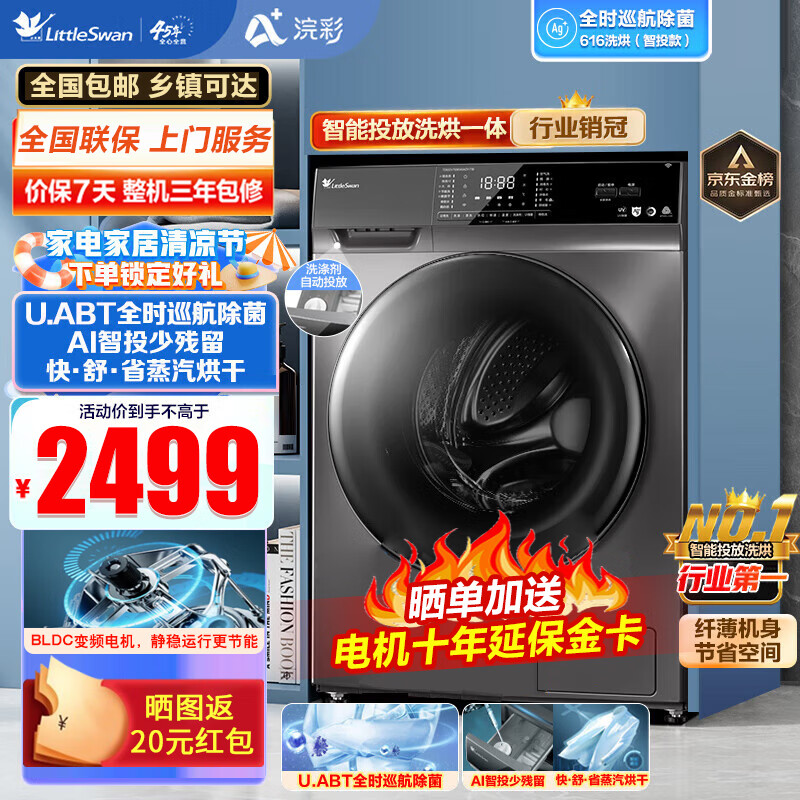 小天鹅(LittleSwan)10公斤滚筒洗衣机全自动 浣彩系列 洗烘一体 智能投放 超薄机身TD616-T1B价格:2499.00元!