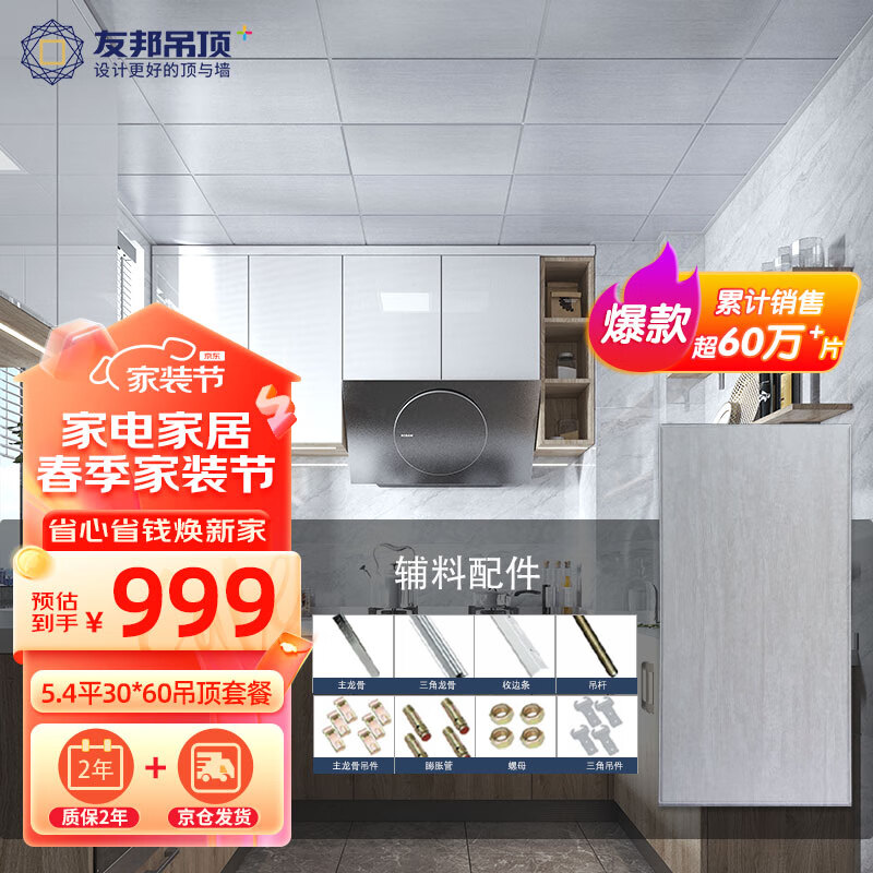 友邦(YOUPON) 集成吊顶铝扣板包安装300*600厨房阳台卫生间家用大板吊顶铝扣板 【5.4平-含辅料】30*60风雅灰价格:1499.00元!