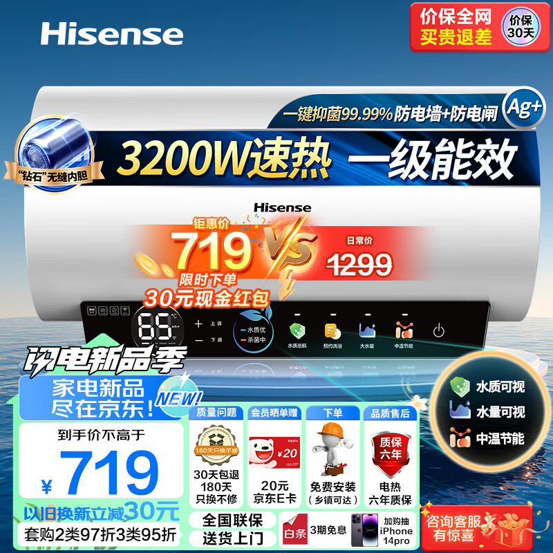海信(Hisense)50升家用电热水器3200W大功率8倍增容 钻石无缝内胆一级能效双重防电保护ES50-C301i智享 以旧换新价格:1249.00元!