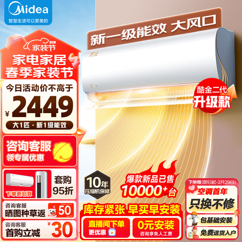 美的(Midea)空调大1匹挂机 酷金 新一级能效 变频冷暖 节能省电 壁挂式 KFR-26GW/N8ZHA1 卧室书房智能空调价格:2449.00元!