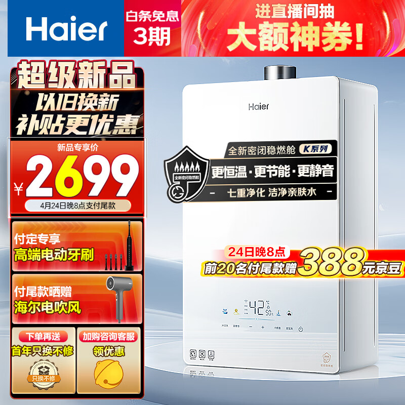 海尔(Haier)16升【K系列KE5】燃气热水器天然气 无级变频水伺服 七重水质净化 一级静音JSQ31-16KE5FXPGU1价格:2699.00元!