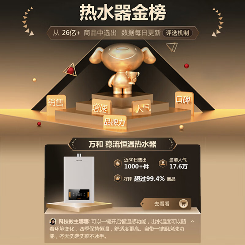 万和(Vanward)14升燃气热水器 天然气家用智能恒温节能自适温智水气双变频JSQ27-521J14【金榜爆品】价格:949.00元!