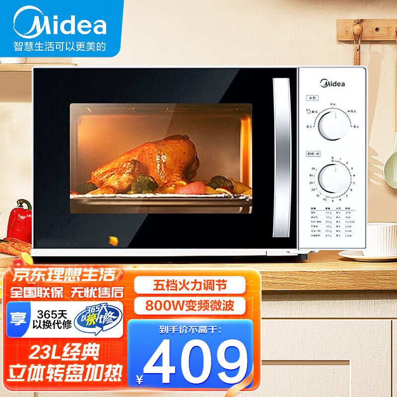 美的(Midea)快捷微波炉 家用23升大容量 双旋钮操控 800W变频大火力 360°转盘加热 五档火力 一级能效 M1-230E价格:409.00元!