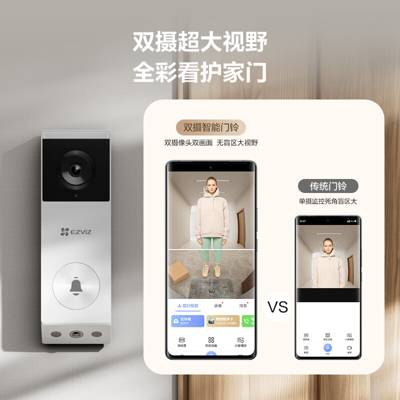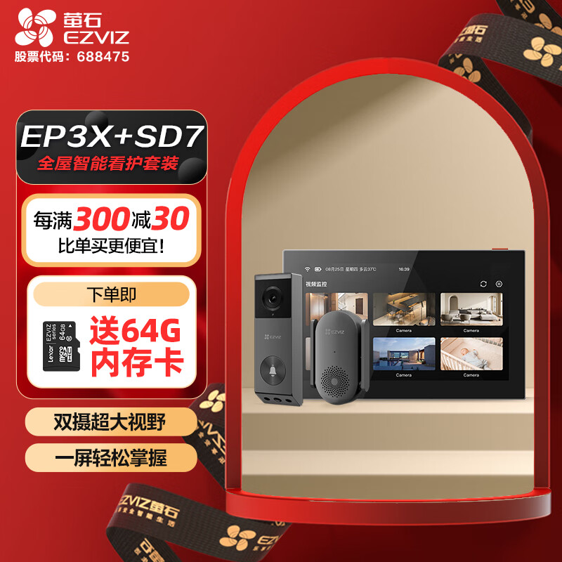 萤石 双摄像头家用门铃套装 双摄500万EP3X门铃摄像机+7英寸全无线SD7智能7英寸智能屏 EP3X+SD7价格:956.00元!