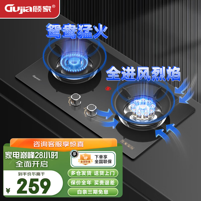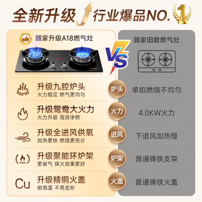 顾家(Gujia)燃气灶双灶大火力家用台式嵌入式两用钢化玻璃炉具一级能效猛火灶JZT-A18价格:359.00元!