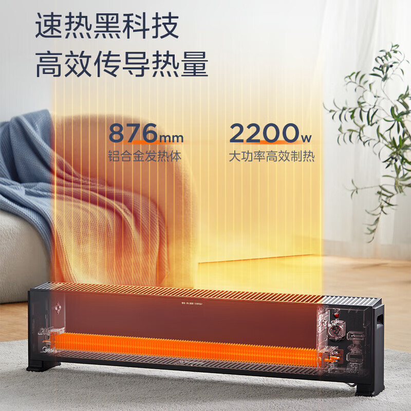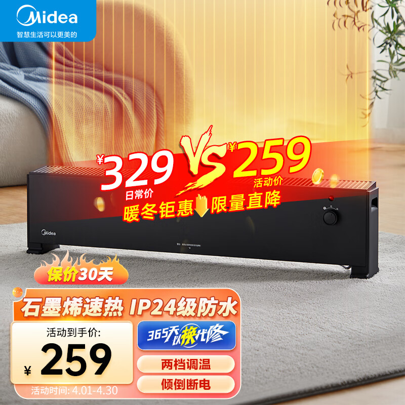 美的(Midea)石墨烯取暖器踢脚线 家用大面积电暖气 客厅卧室节能省电电暖器IP24级防水移动地暖浴室干衣暖风机 HDU22M【石墨烯速热 居浴两用】 踢脚线取暖器价格:329.00元!