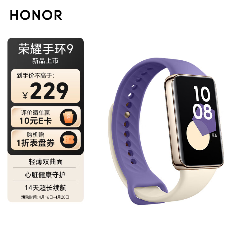 荣耀(HONOR)手环9 晨辉紫 轻薄双曲面 心脏健康守护 14天超长续航 智能手环运动手环价格:229.00元!