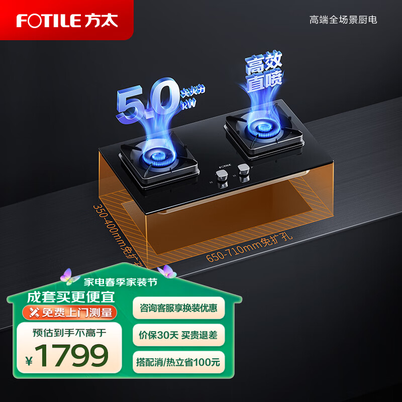 方太燃气灶(天然气)家用嵌入式猛火双灶台灶具 5.0kW*大火力 换装不改孔 TH27B价格:1799.00元!