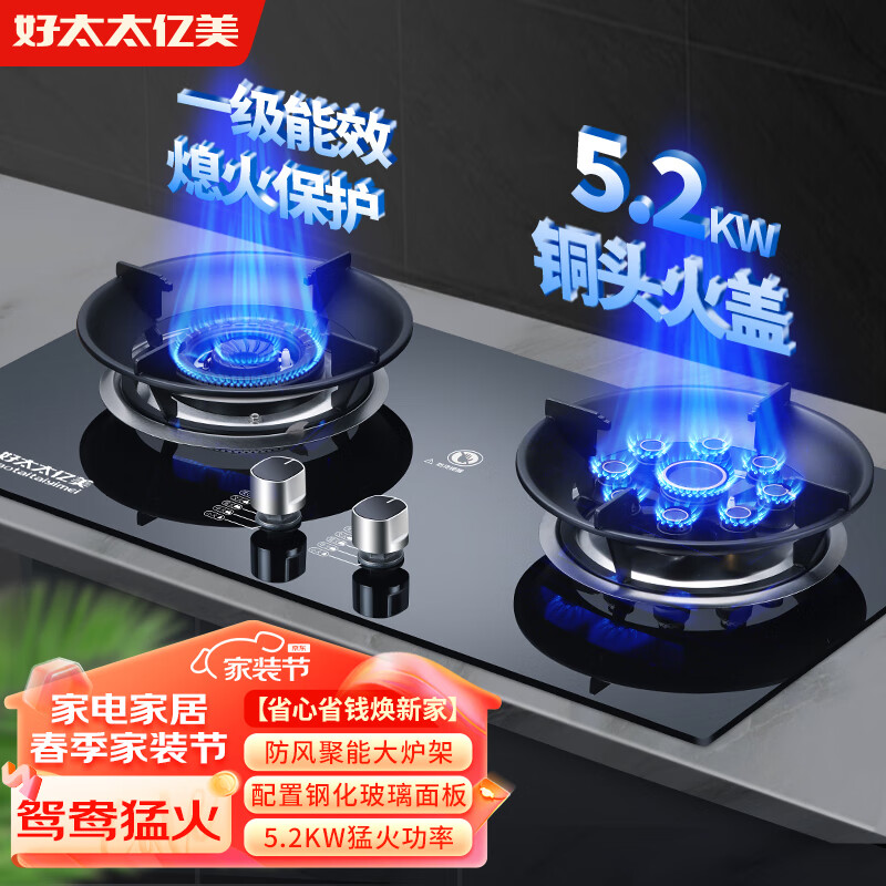 好太太亿美液化气燃气灶双灶家用煤气灶5.2KW台式嵌入式猛火炉具鸳鸯灶JZY-B5Y价格:307.00元!