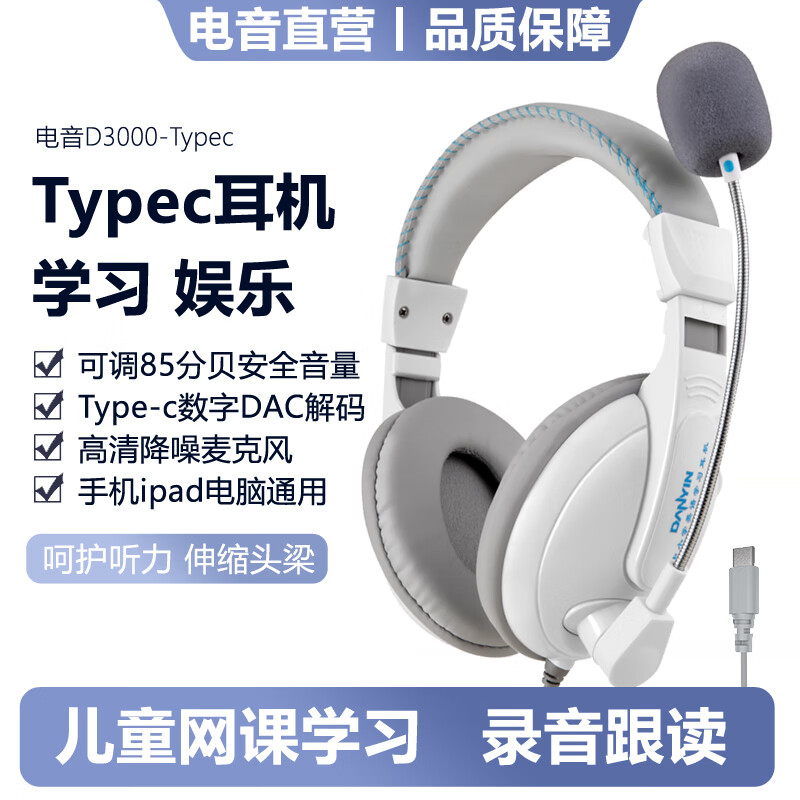 电音Type-c头戴式耳机学生网课电脑学习有线耳麦听说人机语音对话适用于小米荣耀华为平板iPad通用带麦价格:109.00元!