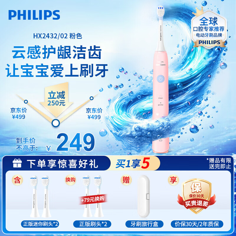 飞利浦(PHILIPS)儿童声波震动牙刷适用4-12岁 2种柔护模式温和清洁 自带2支刷头 生日礼物 儿童泡泡刷 粉色价格:499.00元!
