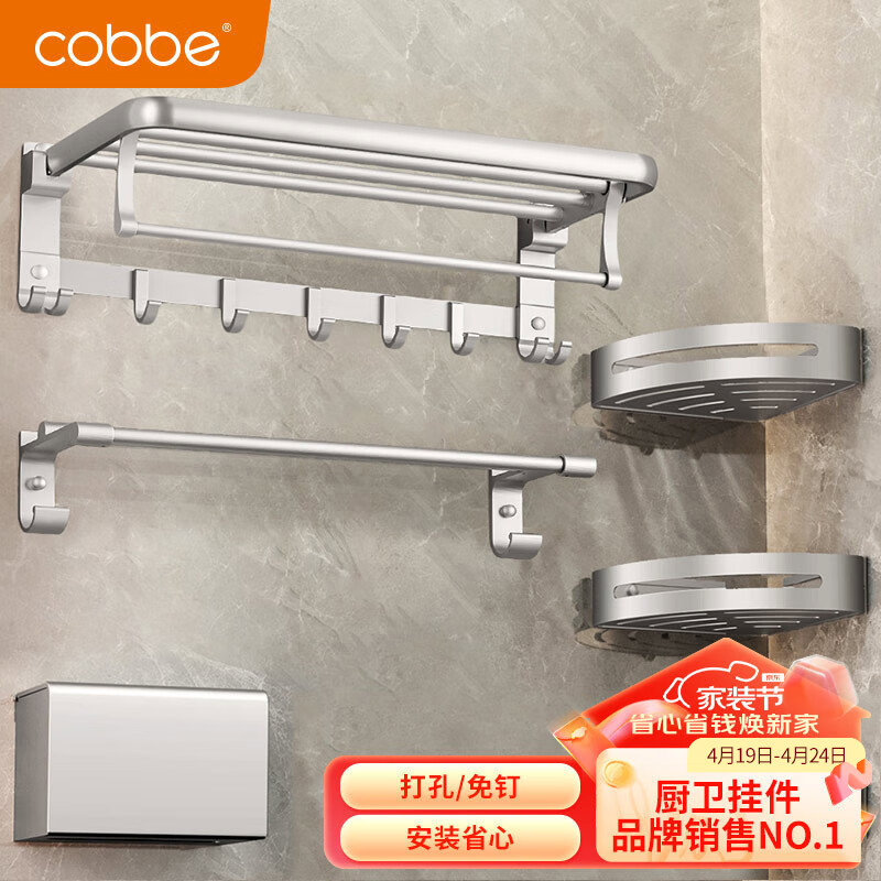 卡贝(cobbe)毛巾架免打孔太空铝浴室置物架卫生间挂件厕所浴巾架卫浴五金套装价格:198.00元!