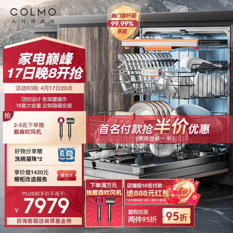 COLMO 16套大容量洗碗机 定制门板隐藏安装 双动力环流热烘 升级三层碗篮储存 168H鲜存 G53价格:8499.00元!