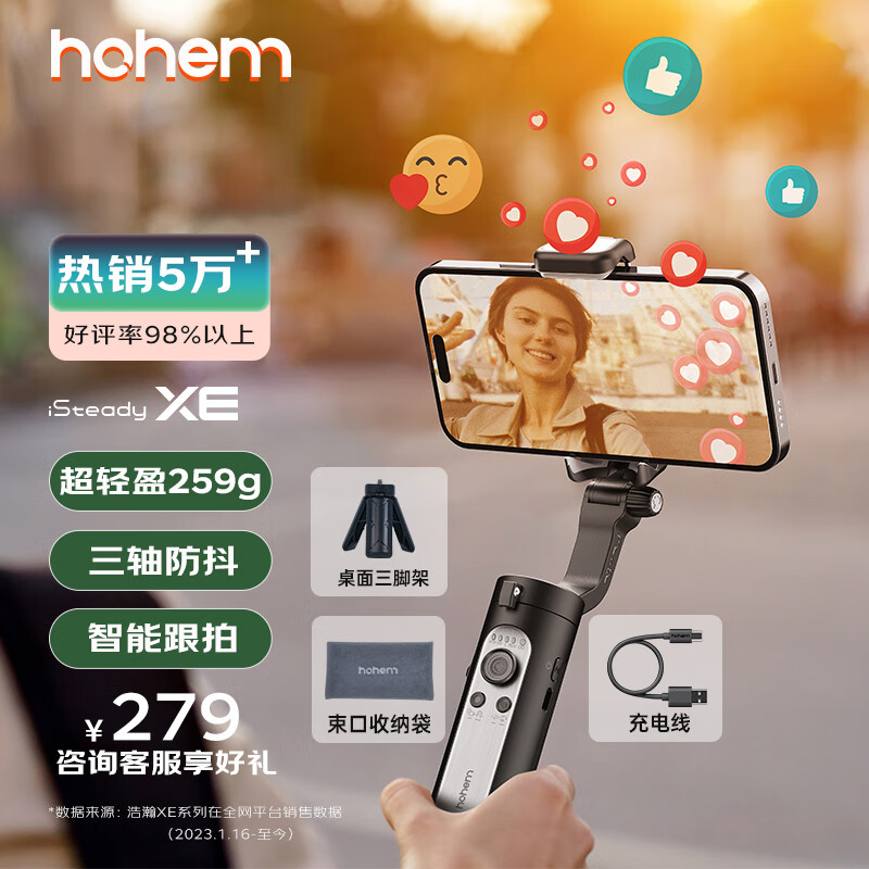 浩瀚(hohem)XE 手机稳定器 手机云台 小巧可折叠三轴云台稳定器 直播vlog神器 智能手持云台价格:279.00元!
