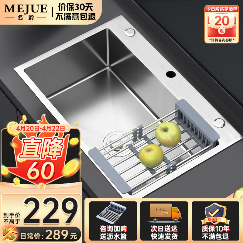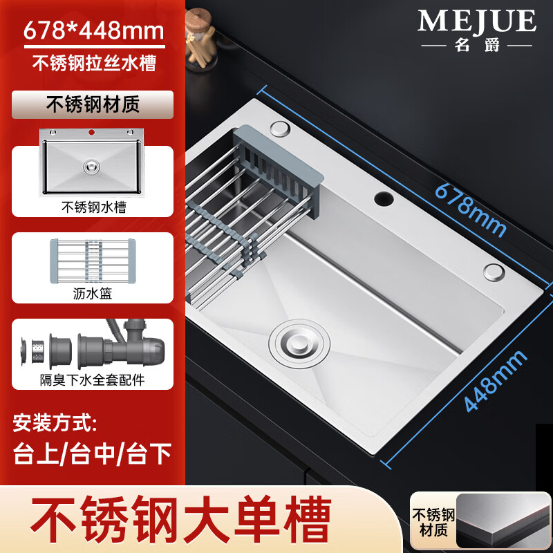 名爵(MEJUE)厨房水槽不锈钢单槽洗菜池洗碗池一体盆台上台下加厚水槽Z-02411价格:289.00元!