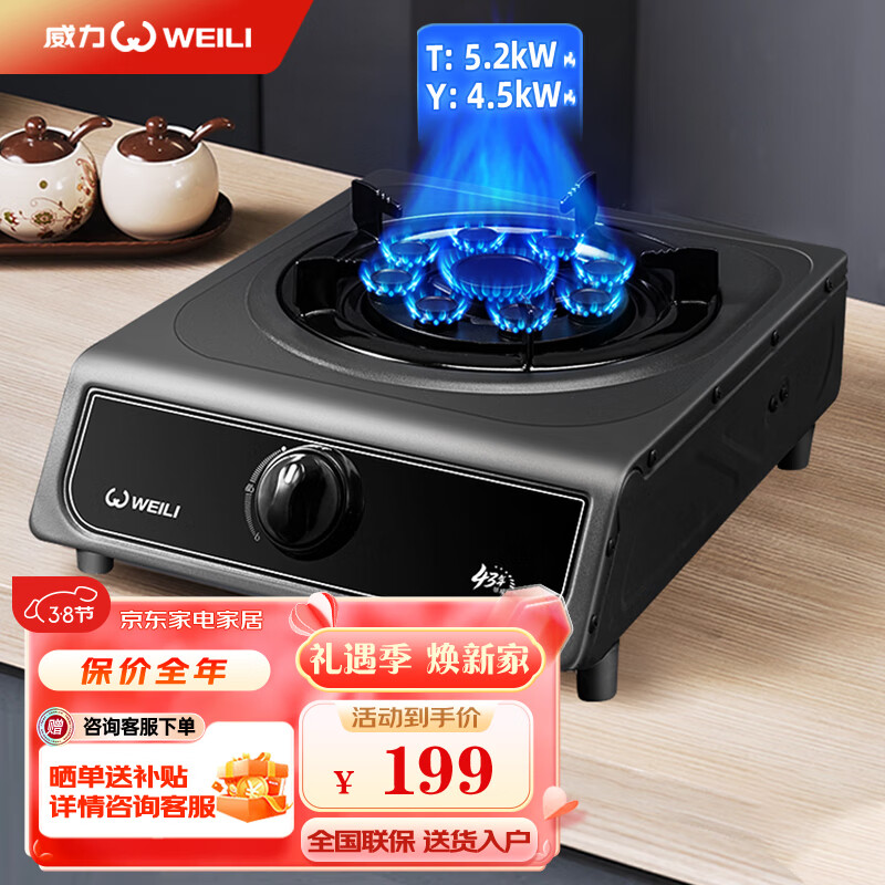 威力(WEILI)燃气灶台式5.2kw九腔猛火灶不沾油涂层炉具出租屋煤气灶单灶家用厨房单眼灶具WLD7S(天然气)价格:199.00元!