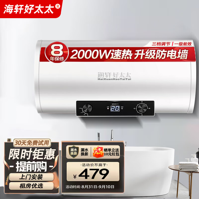 海轩好太太电热水器 家用卫生间洗澡储水式80升一级节能省电出租房小型速热 NBC-S22-80 上门安装价格:449.00元!