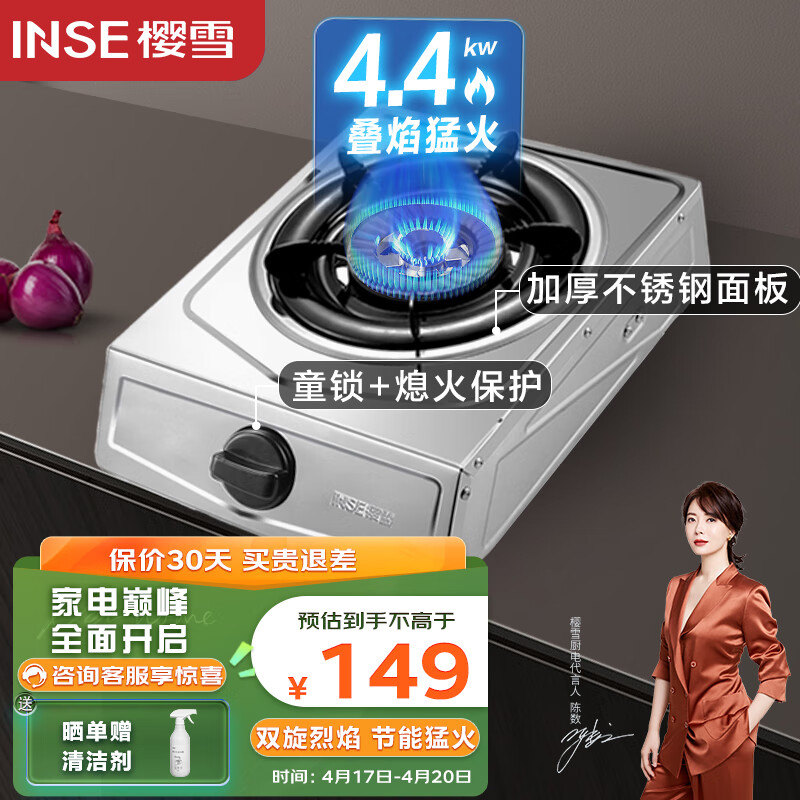 樱雪(INSE)燃气灶单灶 不锈钢面板 台式煤气灶 4.4kW大火力 家用猛火节能单眼灶 JZY-2121(G)W液化气价格:149.00元!