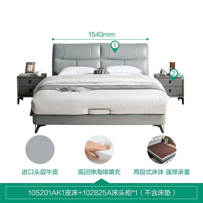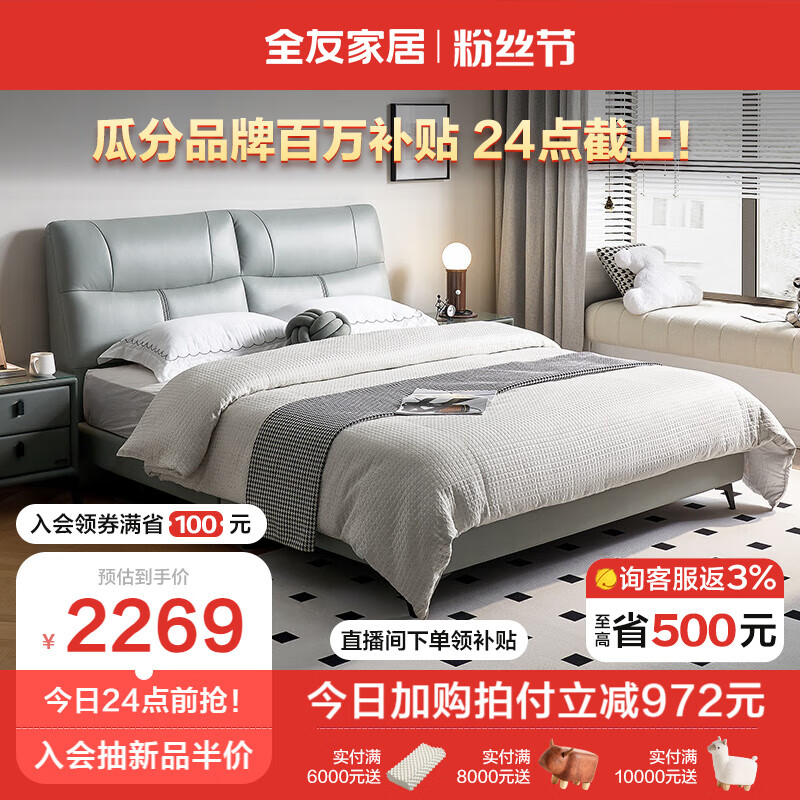 全友家居 真皮艺床现代轻奢主卧室头层牛皮双人大床1.8x2米家具105201价格:3241.43元!