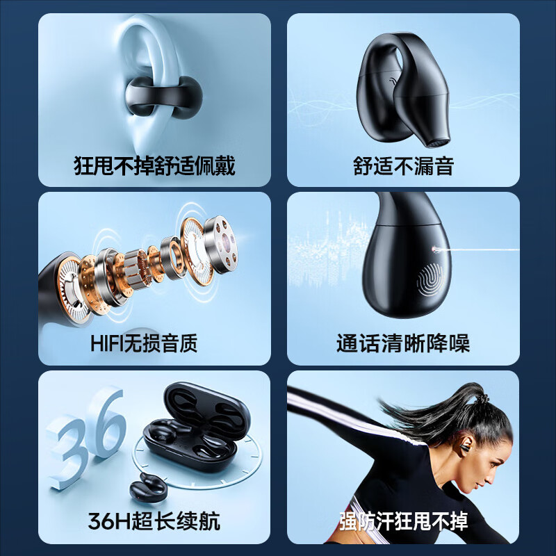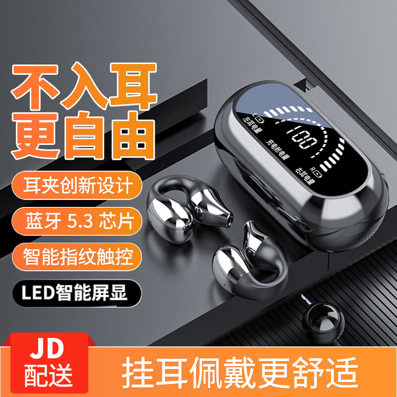 XAXR【2024升级】夹耳式真无线蓝牙耳机骨传导概念不入耳跑步运动通话降噪华为苹果通用S03黑色数显价格:119.90元!